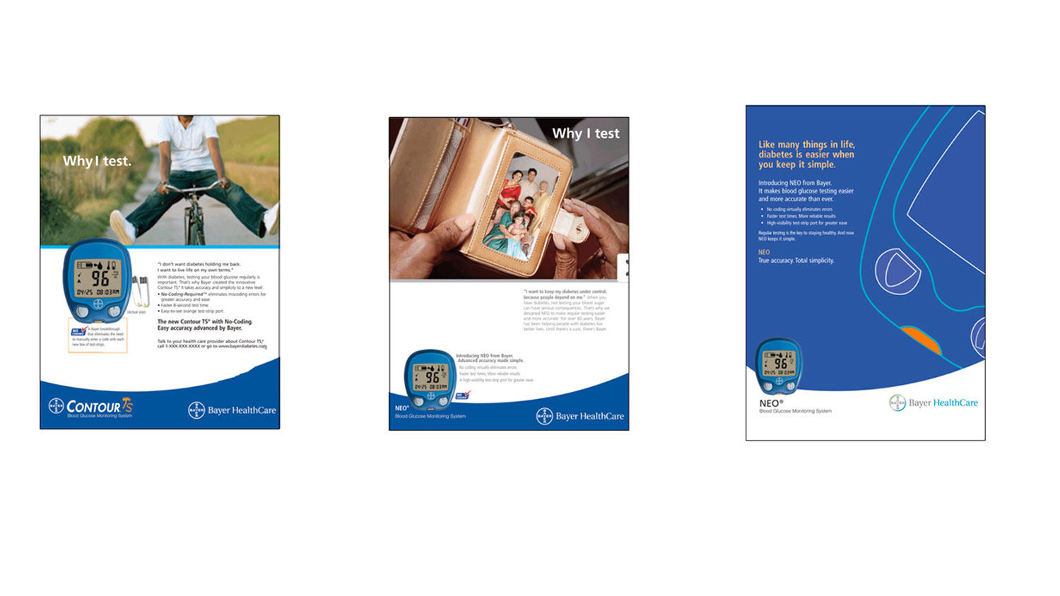 Challenge: Diabetics don’t test their blood sugar enough if they are not comfortable with their device that tests the level of their sugar. For 60 years, Bayer has been helping diabetics. The Neo Blood Glucose Monitoring system is easier to use and more accurate than other monitoring systems. Ads were created to encourage people with diabetes to test their blood sugar more often.