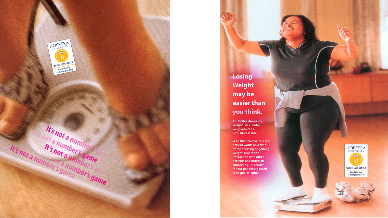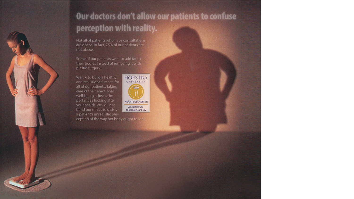 Solution: An ad campaign promotes that the Hofstra Weight Loss center helps students to eat properly while staying healthy. This program also offers additional counseling for students who are prone to eating disorders such as anorexia nervosa and bulimia.