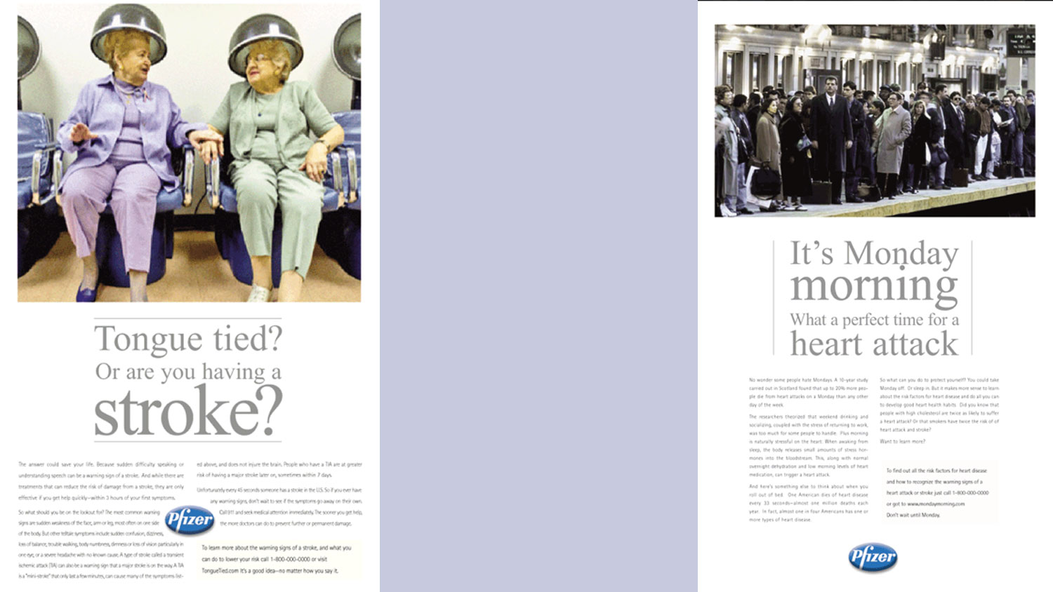Solution: Stroke ad: The ‘public service’ style ad portrays a story f the interaction between two older women at the hair salon. The ad’s purpose is to instruct readers to learn more about the potential warning signs of a stroke and motivate them to call an 800 toll-free hotline promoted by Pfizer. Heart attack ad: The ad portrays an image of the place and time most people have heart attacks. We wanted the viewer to contact our client about research that most heart attacks occur on a Monday after a weekend of drinking. In addition, we wanted people to discover what warning symptoms may signify a heart.