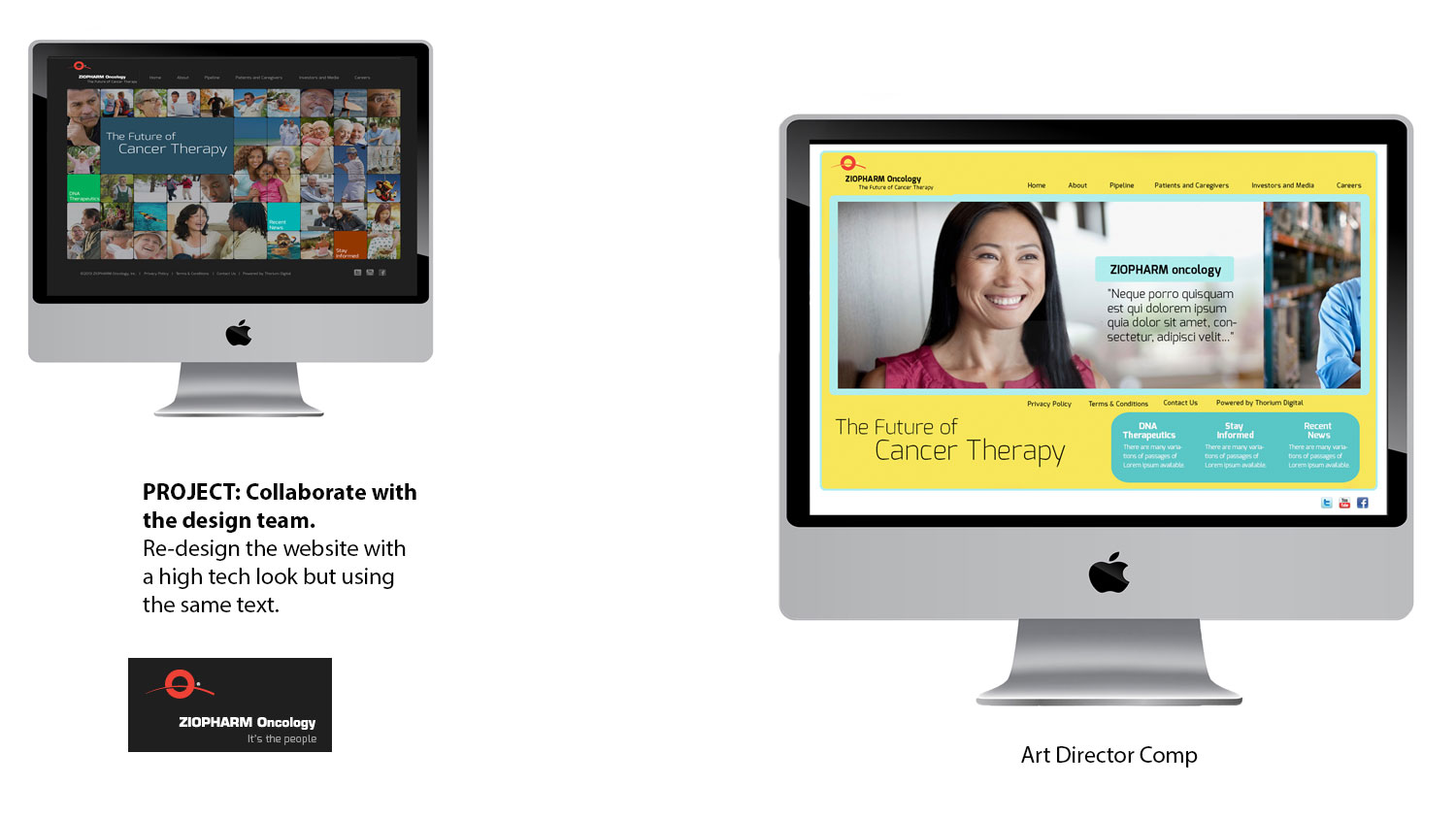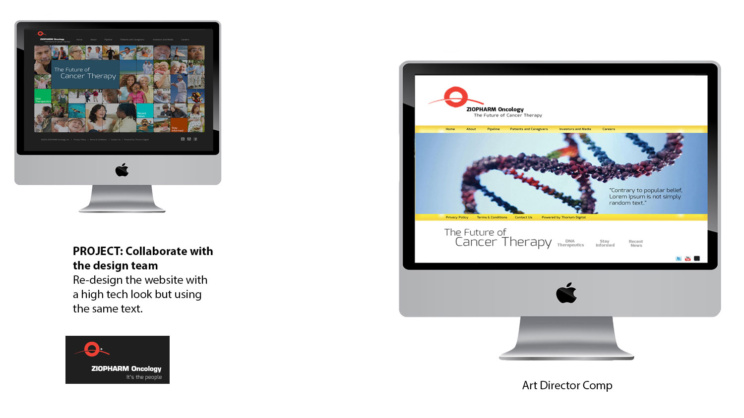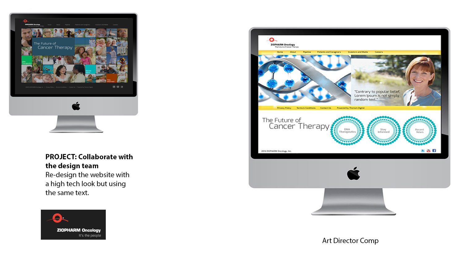 Solution: On the home page I replaced the grid of photos with a slideshow. I used patient images that did not resemble the ones used on typical pharmaceutical drug sites. For one of my comps, used a photo of a glass DNA strand instead of one that depicted a scientific look and a circular icon that represented the DNA cells. One comp had a white background and the other used shades of green and yellow. The last comp was a combination of the first two. These designs are clean and user friendly. The upper left comp was selected.